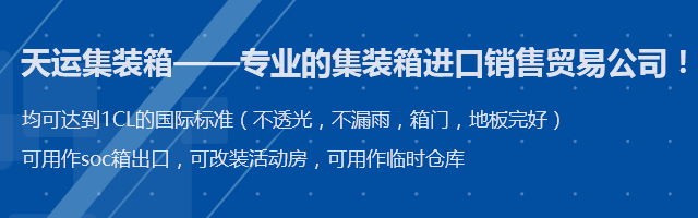青島天運集裝箱服務(wù)有限公司,是專業(yè)的集裝箱(進口和出口)銷售租賃貿(mào)易公司,公司與各大船公司租箱公司保持著密切的合作關(guān)系,箱源充足,所有出售集裝箱均可達到CW適貨標準或IICL的國際標準(不透光,不漏雨,箱門,地板完好)可用作soc箱出口,可改裝活動房,可用作臨時倉庫。
